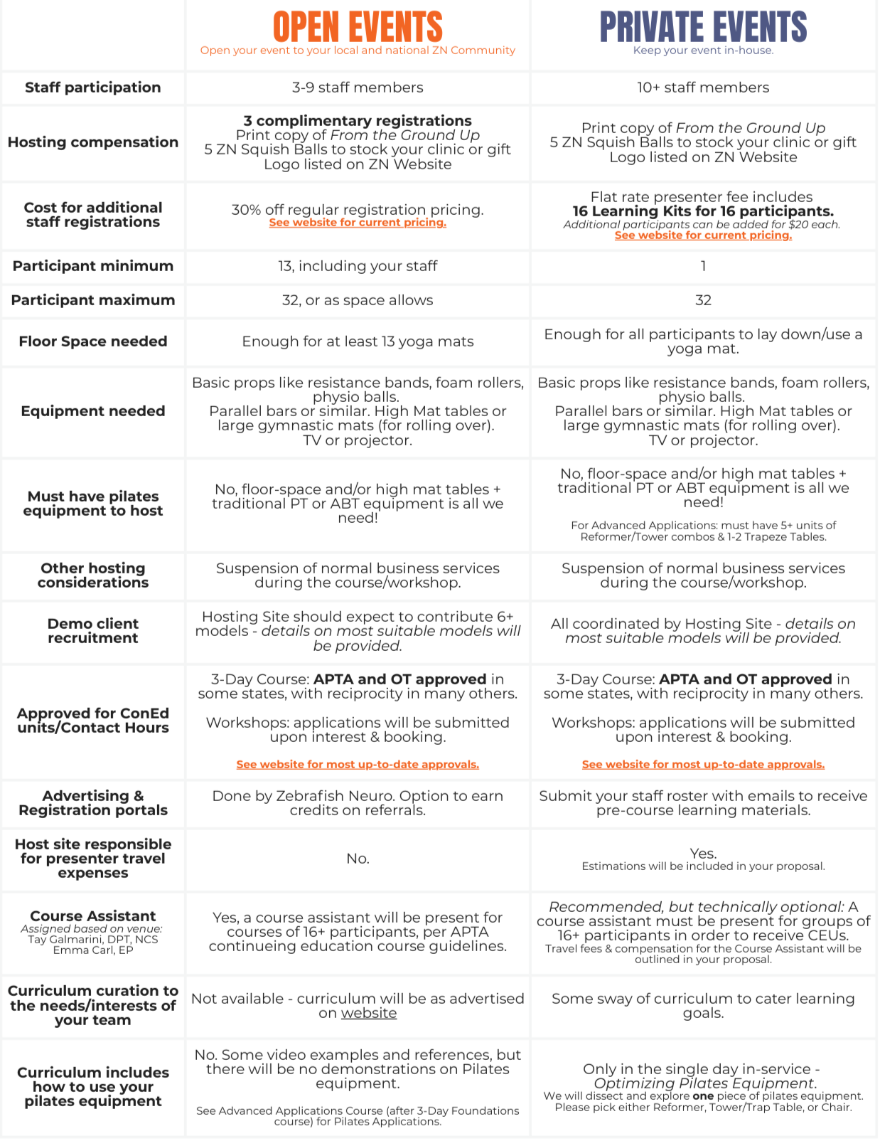 PRIVATE events: presenter fees are flat rate for up to 16 participants. Extra fees apply for 17+ participants for Learning Kits (printed guidebook & squish ball and teacher assistant fees, per APTA student:teacher ratio standards).